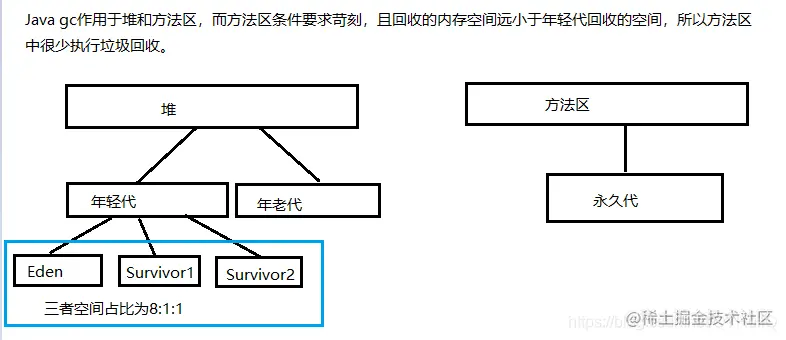 Java内存分配机制:这里所说的内存分配主要是指在堆上分配。堆区分为两个物理区域:年轻代和年老代(年轻代与老年代的比例是1:2,这个比例可以通过参数设定)。年轻代又被分为三部分:Eden、Survivor1(From Survivor)、Survivor2(To Survivor),这三部分的空间占比分配在JVM默认是8:1:1(可以通过参数设定)。