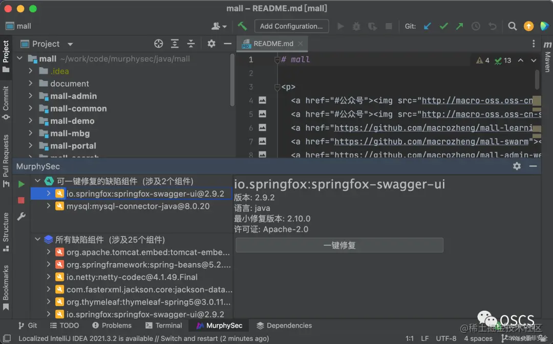 在 Jetbrains IDE 插件市场搜索 murphysec 安装检测插件,一键检测一键修复