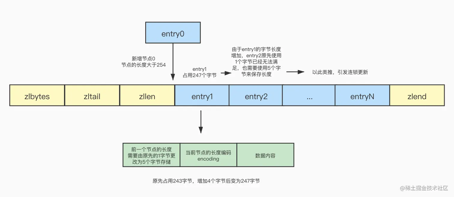 此时在列表的头部需要新增加一个节点,并且节点的长度大于254,这个时候原先的头结点entry1 prevrawlen使用1字节已经不能满足当前的情况了,必须要使用5字节存储,因此entry1的prevrawlen变成了5字节,entry1的长度也会跟着增加4个字节,已经超过了254字节,因为大于254就需要使用5个字节存储,所以entry2的prevrawlen也需要改变为5字节,后面的以此类推,引发了连锁更新,这种情况称之为连锁更新: