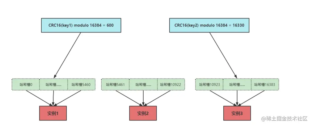 Redis的Cluster集群又被称为切片集群,Cluster的所有实例都是主节点,集群采用哈希槽(hash Slot)来处理实例之间的映射关系,在集群中总共有16384个哈希槽,默认形式是将16384个哈希槽分配给所有的节点,每个实例节点分配一段哈希槽类似数据分区,每个键值按照CRC16算法得到哈希值再将其对16384取模**CRC16(key)mod 16384 **通过最终的结果得到key值存在的哈希槽位置,结构图如下所示