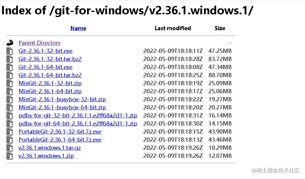 - 进入官网:git-scm.com/downloads ,由于官网下载太慢可以通过淘宝的开源镜像下载 网址:registry.npmmirror.com/binary.html… ,下载版本更具自己的需求选择即可。