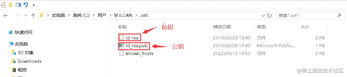 之后打开C盘下用户文件夹下的.ssh的文件夹,会看到 id_rsa.pub