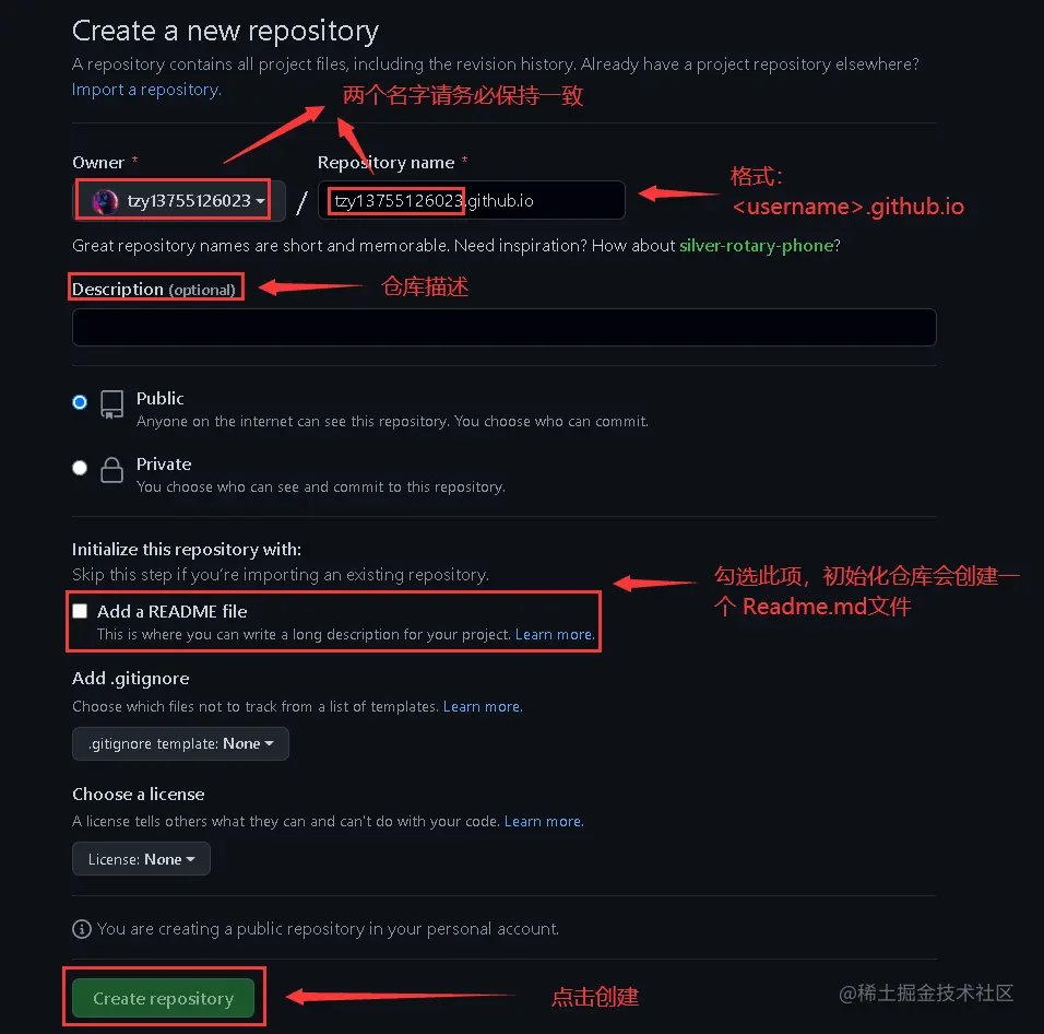 <用户名>.github.io Description:为描述仓库(选填)- 勾选