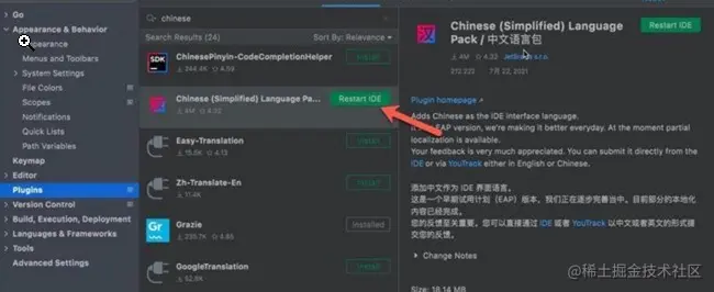 点击【plugins】,点击【marketplace】,在搜索栏搜索【chinese】然后回车,选择第二个中文语言包,点击【install】进行安装。