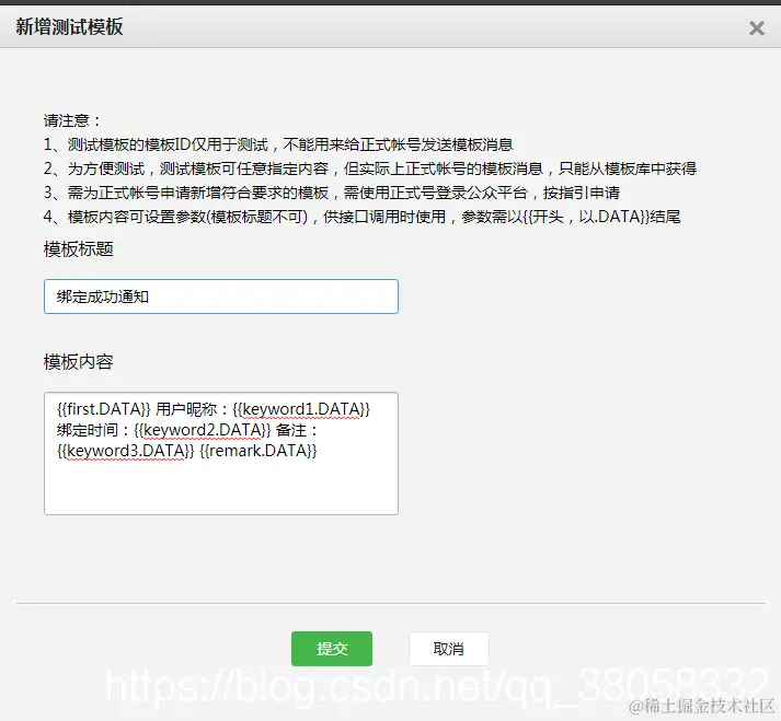成功之后,这个后面的我们会用到,模板消息的数据有个规范