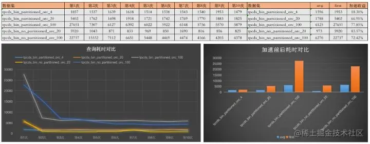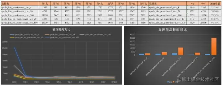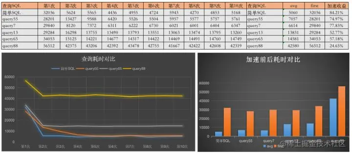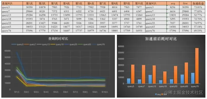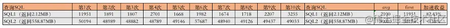 ○“first”列的值就是第1次查询的耗时。“加速收益”列的计算方式是:(first - avg) / first。