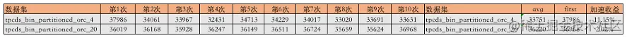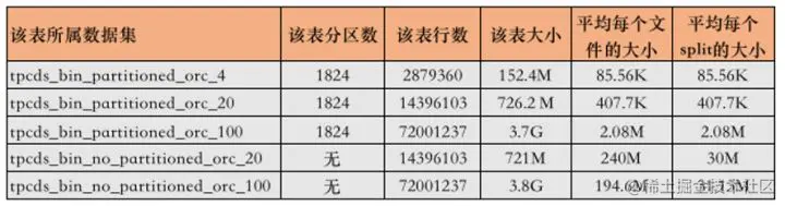 测试方法:采用选取tpc-ds中查询同一张事实表的不同query,去查询同一个数据集。保证表结构相同、文件数相同、文件大小相同、分区数相同,仅仅SQL不同。
