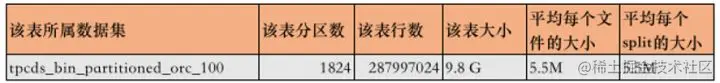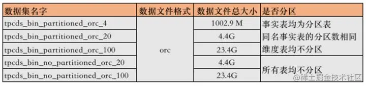 - 以下查询的数据集是tpc-ds数据集tpcds_bin_partitioned_orc_100,整个数据集的大小为23.4G。