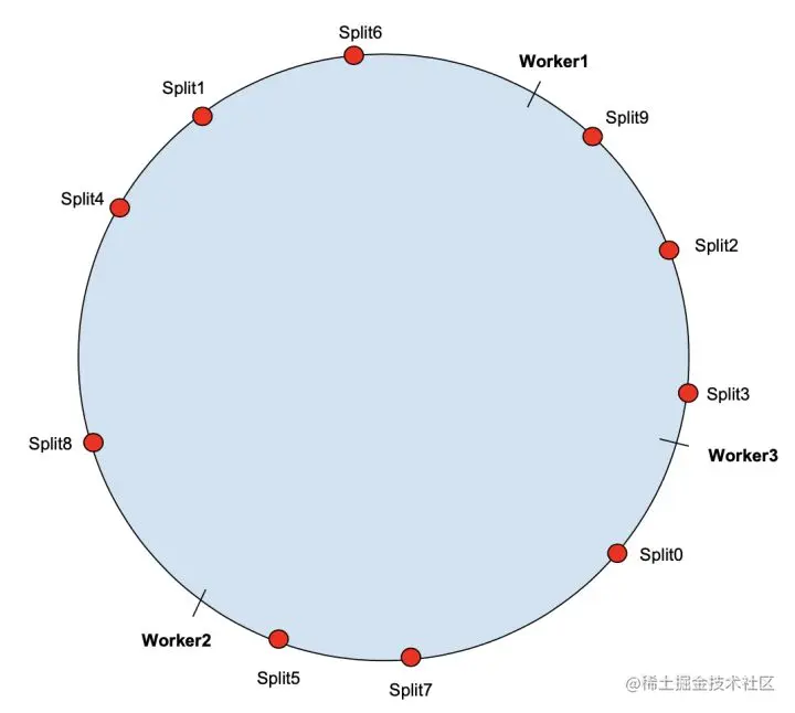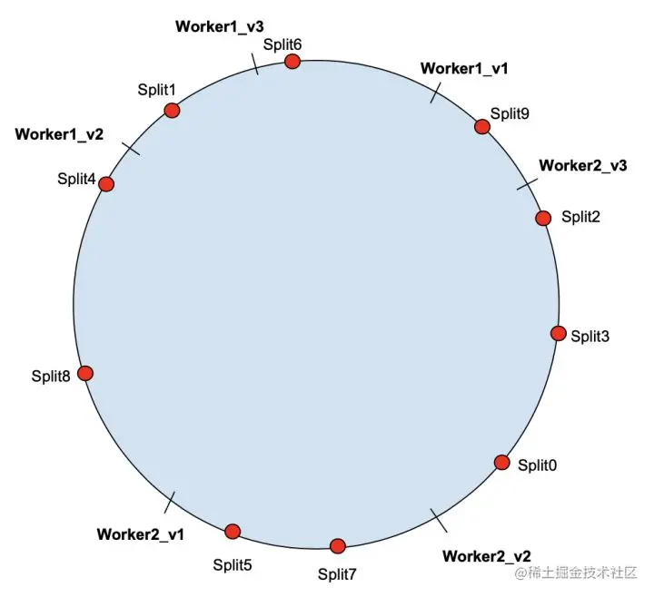 首先,worker节点被散列到哈希环上。每个分片都被分配给哈希环上与该分片的哈希值相邻的worker(注:这里“相邻”定义为从分片哈希值所在位置,按顺时针方向找到的第一个worker节点)。