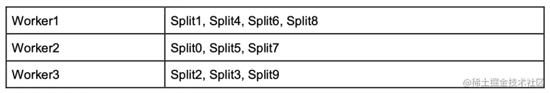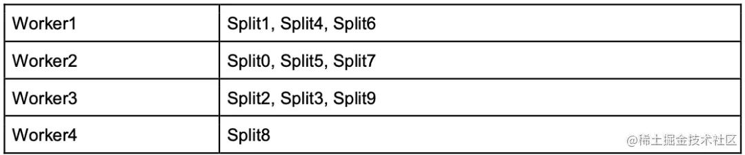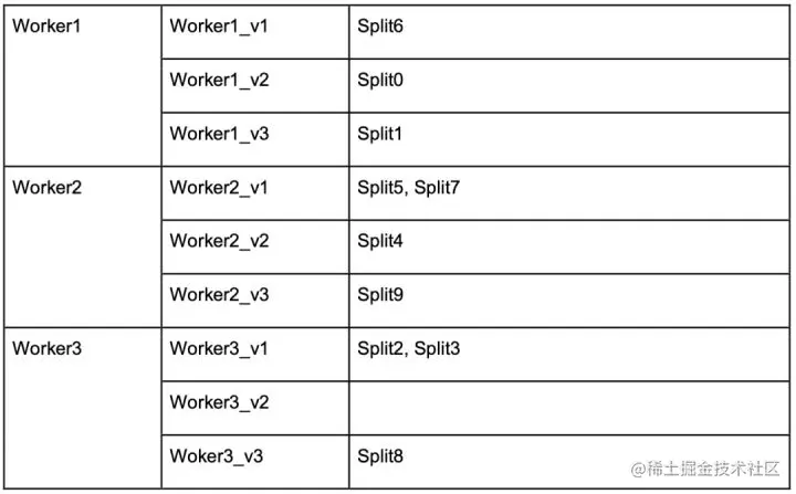 现在,如果worker2由于某种原因下线,那么根据算法,分片0、5和7将被调度到对应下一个哈希值的worker,也就是worker1上。