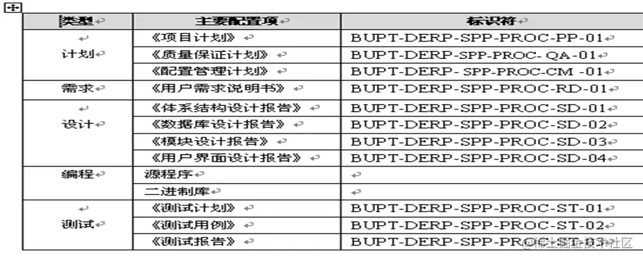下面这个表给出了某项目的配置项以及对应的标识符即开发过程中产生的文件与文件名:
