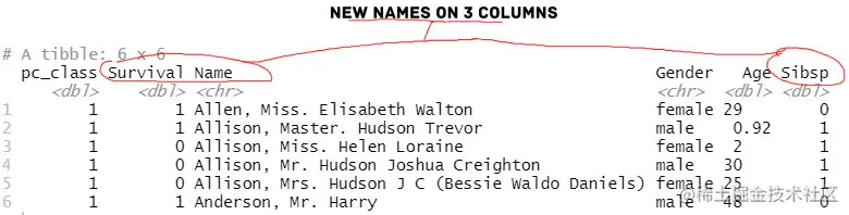注意我们在上面的代码中只使用了names() 。这里值得注意的是,如果字符向量(<-的右边)应该包含和列名一样多的元素。否则,一个或多个列将被命名为 "NA"。此外,你还需要知道各列的顺序。 在接下来的几个例子中,我们将使用dplyr和rename-family函数来工作。