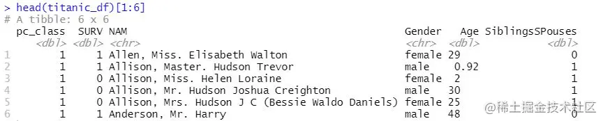 在上面的代码块中,我们首先加载库readxl,然后使用read_excel() 函数来读取titanic.xlsx文件。这里是这个数据框架的前6行。