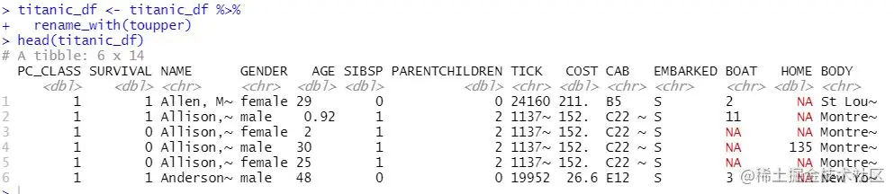 在下一个例子中,我们将使用rename_with() 函数和toupper() 函数将列名改为大写。