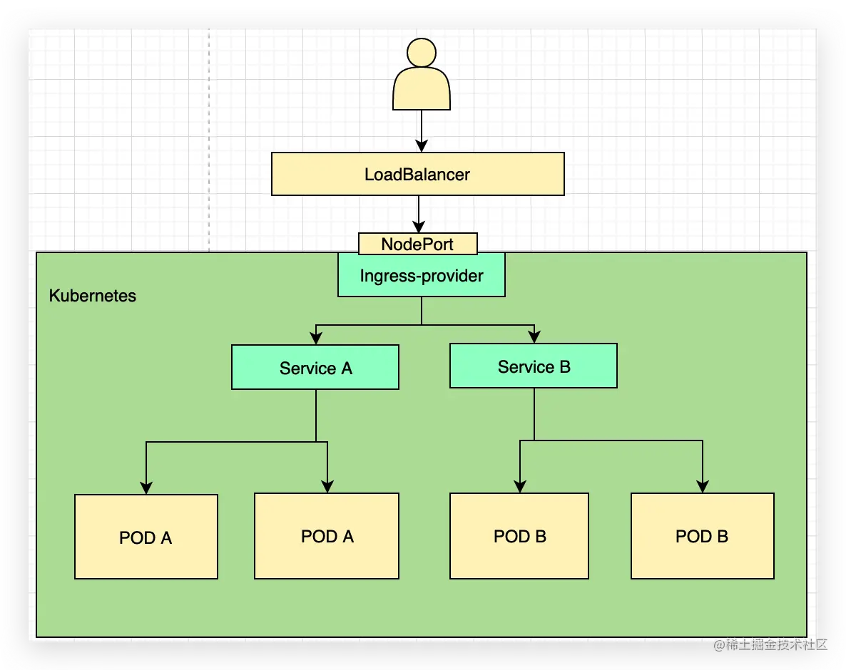 如下图所示在最前面有一个四层 LB 实现端口 80/443 转发至 ingress-provider 的 Service 的 NodePort,K8s 集群内部配置有多个 service。