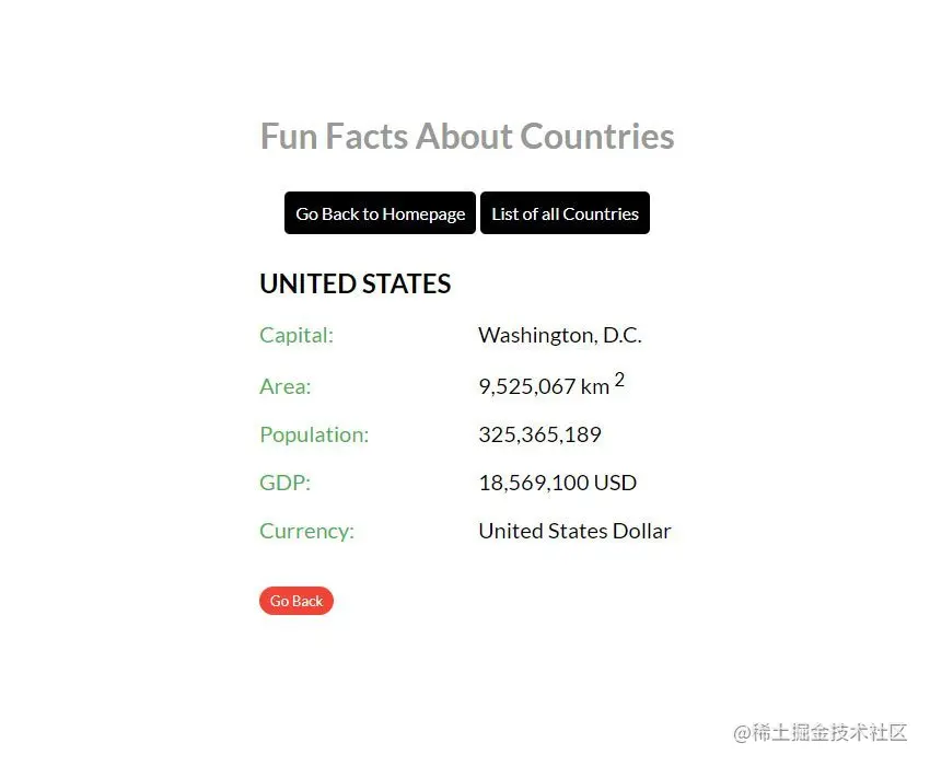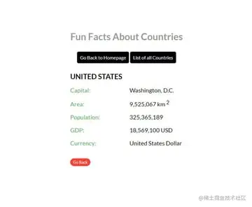 在每个国家的详细信息之后有一个返回按钮。这个后退按钮可以让你回到前一个组件或页面。如果你从HomeComponent 来到CountryDetailComponent ,你会被带回到HomeComponent 。如果你从AllCountriesComponent 来到CountryDetailComponent ,你会被带回到AllCountriesComponent 。