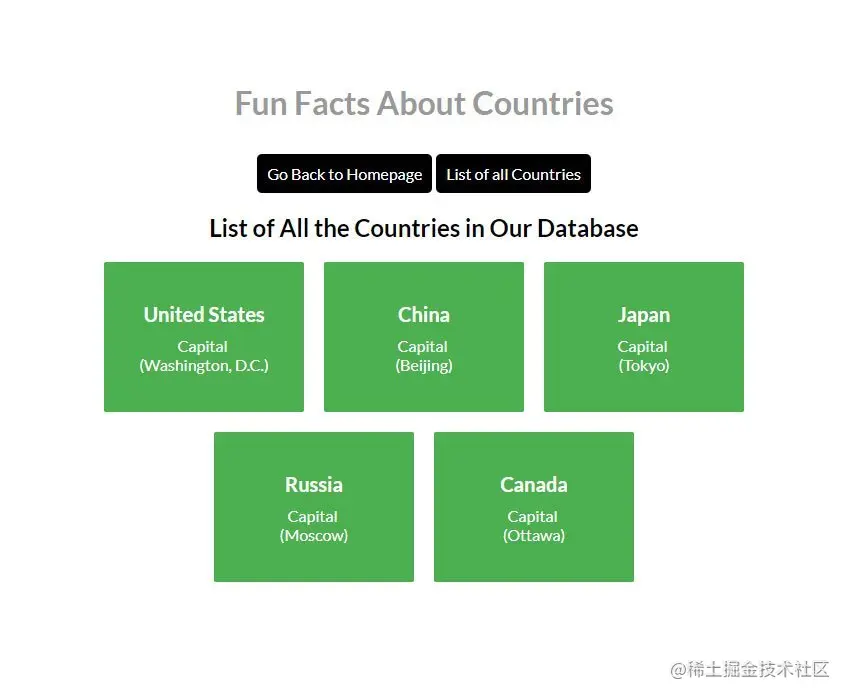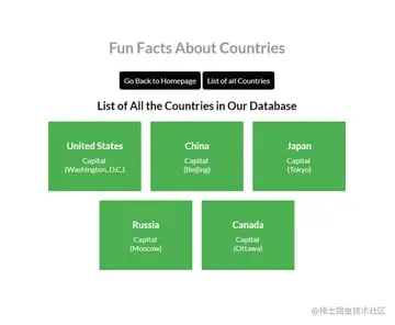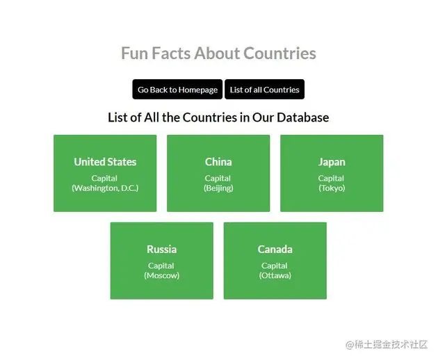 下面的图片显示了 我们应用程序的"所有国家页面 "或 AllCountriesComponent 。这个组件的布局与 HomeComponent 非常相似。唯一不同的是,这次我们列出了所有国家和它们的首都。