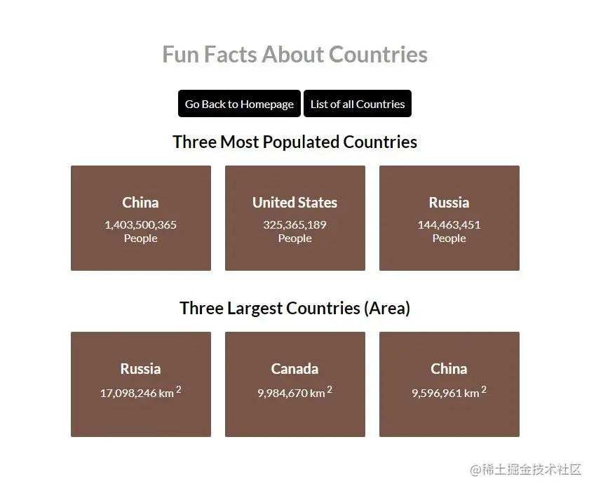 下面的图片是我们的国家信息应用程序中的主页或HomeComponent 。正如你所看到的,每个类别下有三个国家,它们被按降序排列。在创建HomeComponent ,你将学习如何在模板内显示不同国家之前对它们进行排序。