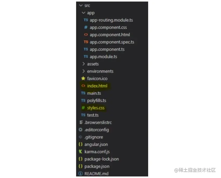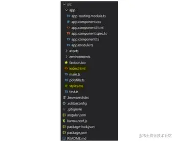 在你运行 ng new country-app 命令后 ,Angular CLI为你创建了一堆文件和文件夹。作为一个初学者,看到这么多文件可能会感到害怕,但你不需要处理所有这些文件。在创建我们的国家应用程序时,我们将只修改 src/app 文件夹 内已有的文件,以及在同一目录下创建新的文件。现在,你应该在 src/app 文件夹 里有五个不同的文件 。这些文件创建了一个应用程序外壳,它将被用来组合我们应用程序的其余部分。在Angular 12中,文件夹结构显示如下。
