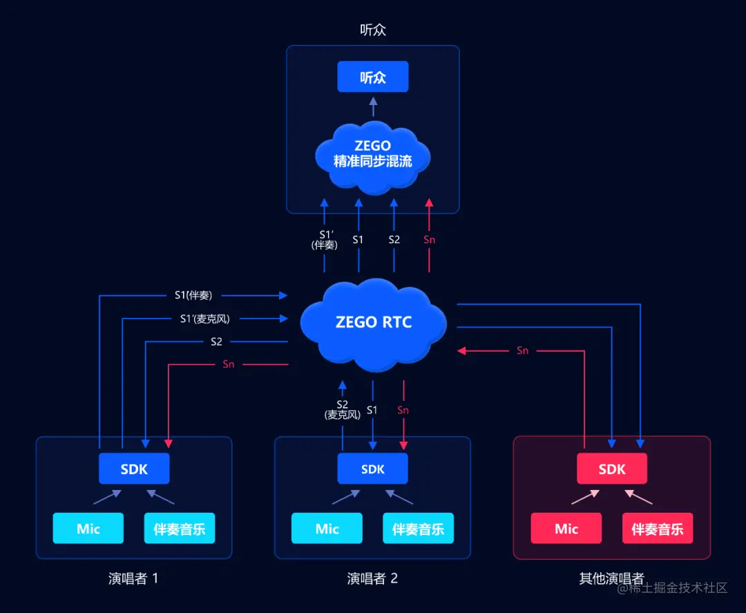 为了突破这两个限制,同时不影响副唱和听众端的体验,即构对方案架构进行了重构,克服了多个技术挑战,实现了合唱者之间的实时互动,也满足了三人及以上的合唱需求。