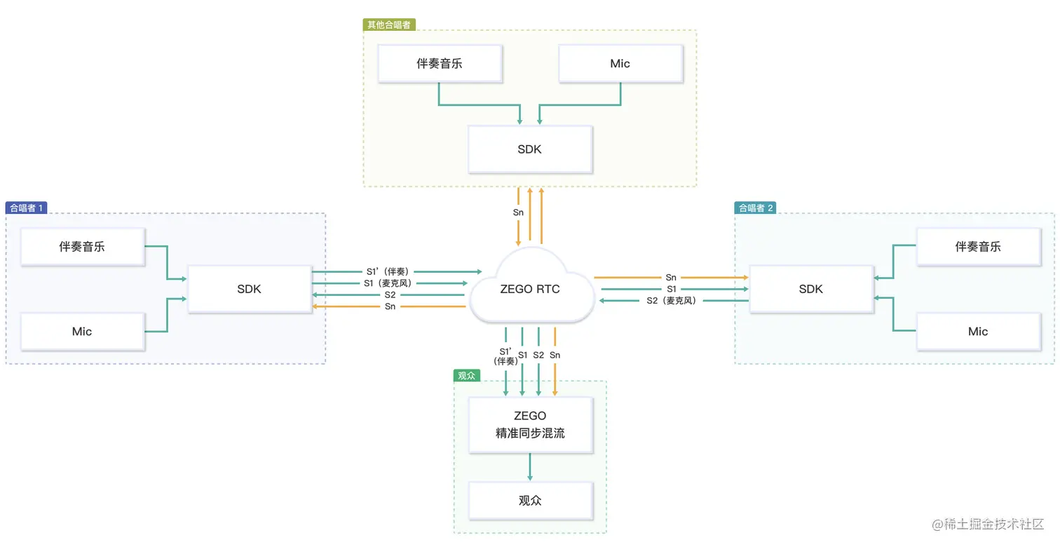 在媒体流方面,合唱者互相进行推拉流,同时会由一名合唱者推出歌曲伴奏,其他合唱者在本地播放伴奏,经过 NTP 进行时间同步。另外,歌曲伴奏和所有合唱者的声音都通过 ZEGO RTC 进行混流服务处理形成一条流,观众只需拉一条流即可听到各端同步的声音,完美实现多人合唱的效果。