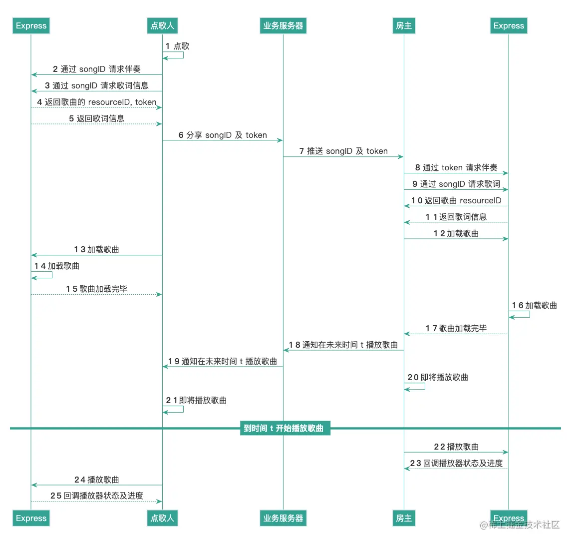 房主通过调用 Express 相关接口进行点歌、下载歌曲和歌词、播放歌曲和发送 SEI 信息等操作,中间则由业务服务器监听房间内歌曲、麦位的信息变更,并通知房间内所有成员。歌词下载完毕后,通过歌词 UI 组件进行逐行或者逐字歌词的展示。