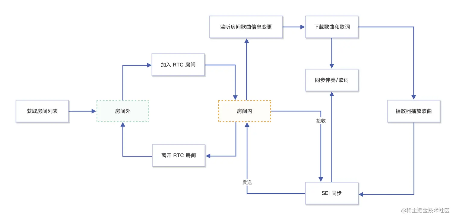 - 通过发送 SEI 信息同步房间内所有人的歌曲播放进度。