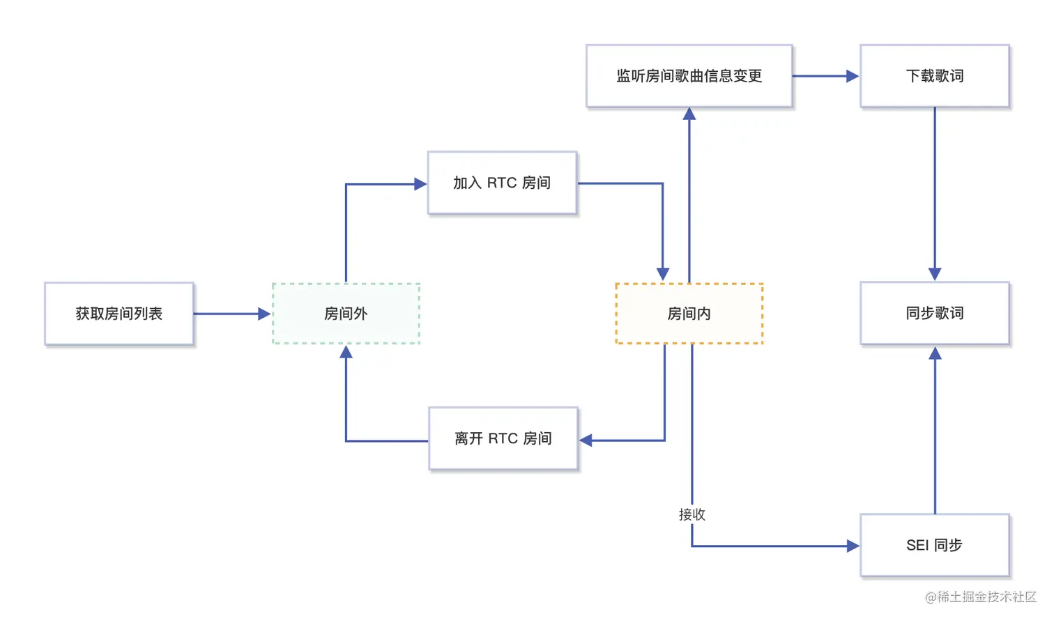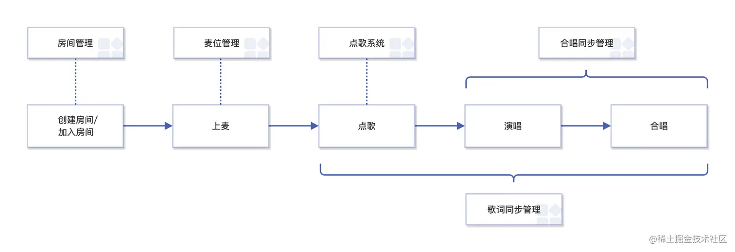 在线 KTV 整体方案包含房间管理、麦位管理、点歌系统、合唱同步管理、歌词同步管理 5 个业务模块,基本业务流程如下:
