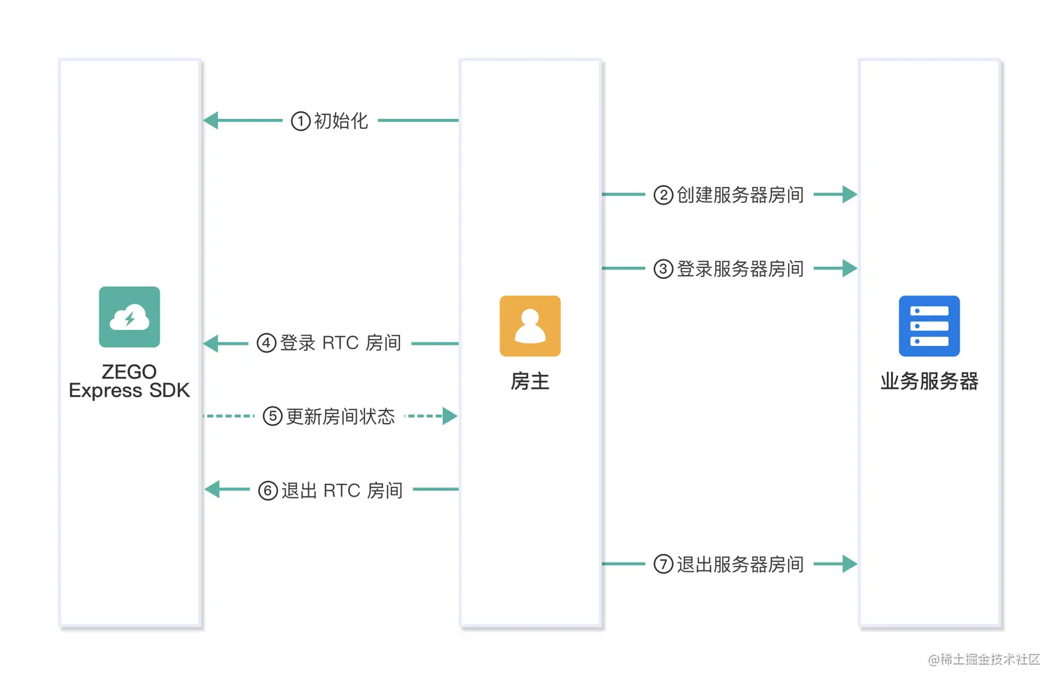 房主需在业务服务器创建房间获取对应的 roomID 和 userID 后,再创建 RTC 房间,然后通过调用 Express 接口 loginRoom 登录房间和 logoutRoom 接口退出房间。