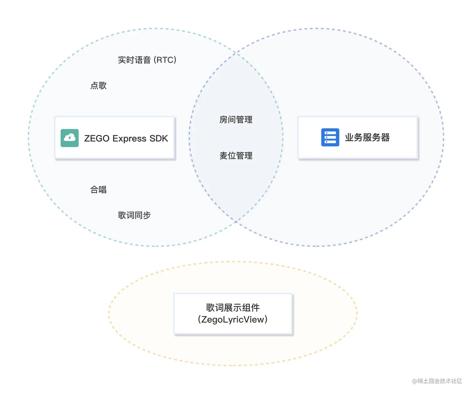 搭建一个完整的在线 KTV 需要实时语音(RTC)、点歌(歌曲的获取与分享)、歌词展示等基础能力,并通过以上基础能力实现合唱、麦位管理、房间管理、歌词展示与同步等业务系统。