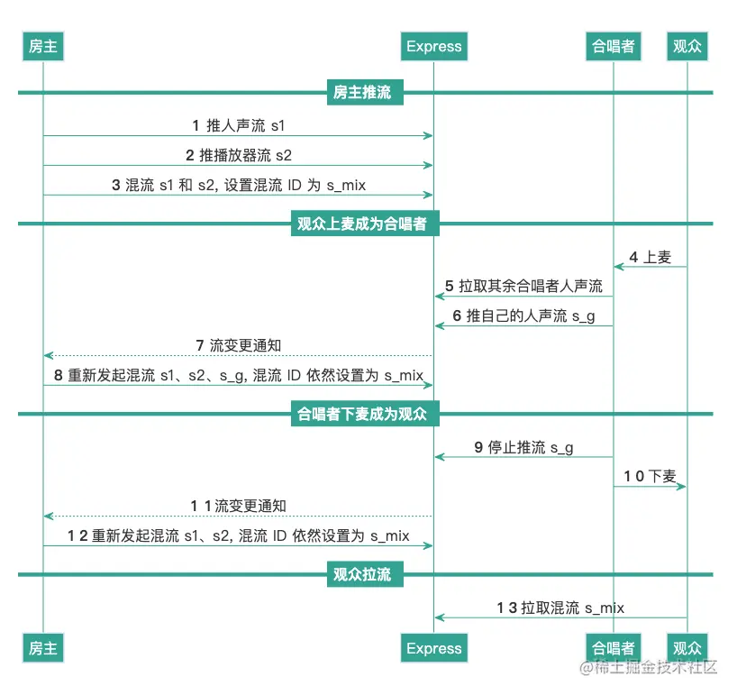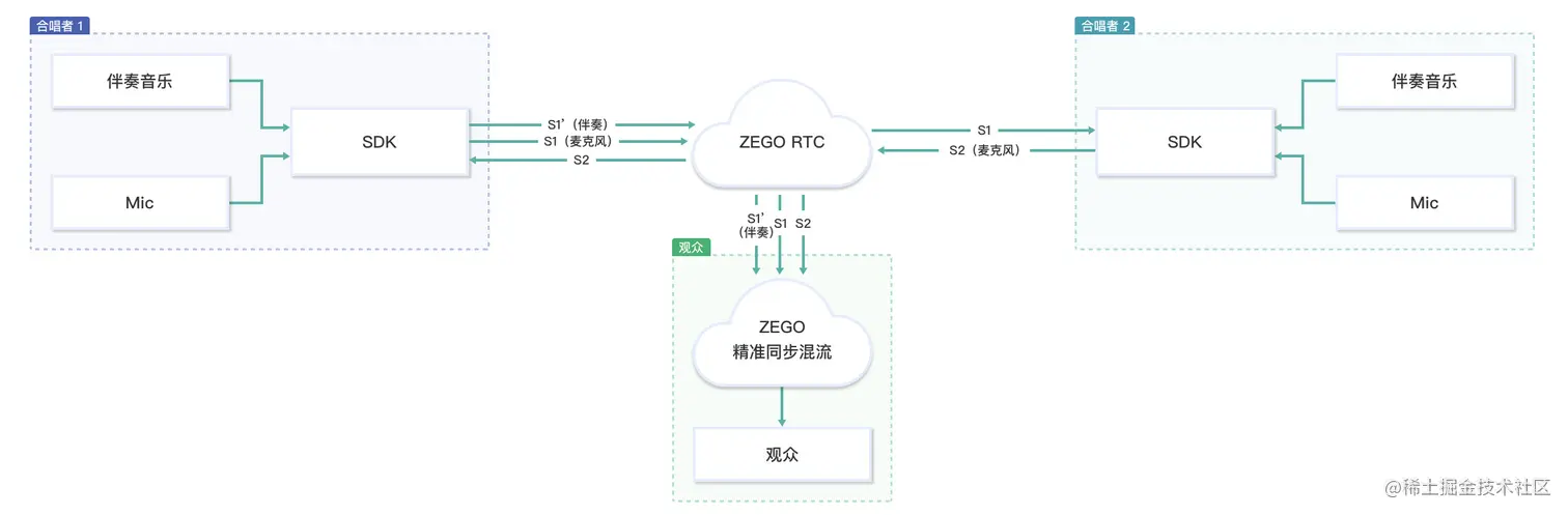- 对于观众而言,歌曲和人声的同步通过Express SDK 提供的精准混流功能实现。