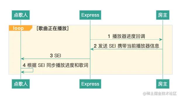 - 对于合唱者而言,歌曲的各端同步主要通过 SEI 消息实现。SEI 携带当前播放歌曲的 songID 以及歌曲播放进度 progress等,用于多端同步播放的信息。SEI 的发送时间间隔可以与播放器进度回调的时间间隔保持一致。