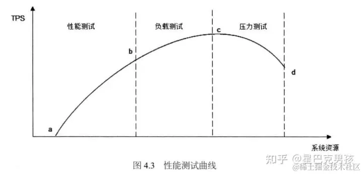 这个指标往往随着并发数的提高,先是逐渐上升,到达系统的最大负载点(上图的c点)后,随后随着并发数上升会逐渐下降,直到到达上图的d点,也就是系统的奔溃点,超过这个点后并发数再增大,系统不能处理任何请求。