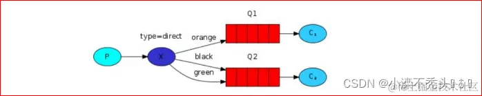 直连交换机X上绑定了两个队列。第一个队列绑定了绑定键orange,第二个队列有两个绑定键:black和green