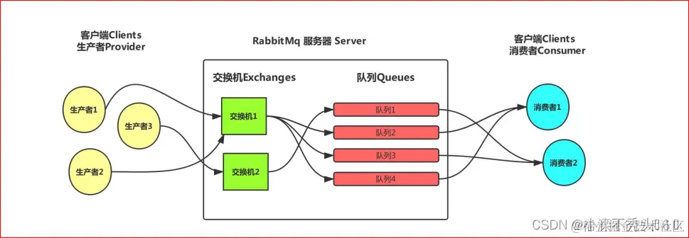 在RabbitMQ中,生产者发送消息不会直接将消息投递到队列中,而是先将消息投递到交换机中,在由交换机转发到具体的队列,队列再将消息以推送或者拉取方式给消费者进行消费