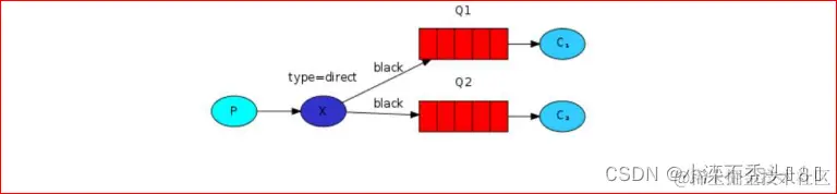 同一个绑定键可以绑定到不同的队列上去,可以增加一个交换机X与队列Q2的绑定键,在这种情况下,直连交换机将会和广播交换机有着相同的行为,将消息推送到所有匹配的队列。一个路由键为black的消息将会同时被推送到队列Q1和Q2.
