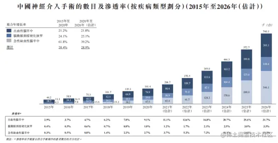 中国神经介入手术的数量由2015年的约46,200台增加至2020年的161,400台,复合年增长率为28.4%,并预期于2026年进一步增加至约740,500台,2020年至2026年复合年增长率为28.9%。于三种神经介入手术(即出血性脑卒中、脑动脉粥样硬化狭窄及急性缺血性脑卒中的手术)中,出血性脑卒中手术目前于中国最为普遍,占2020年所有神经介入手术数目约46.4%。