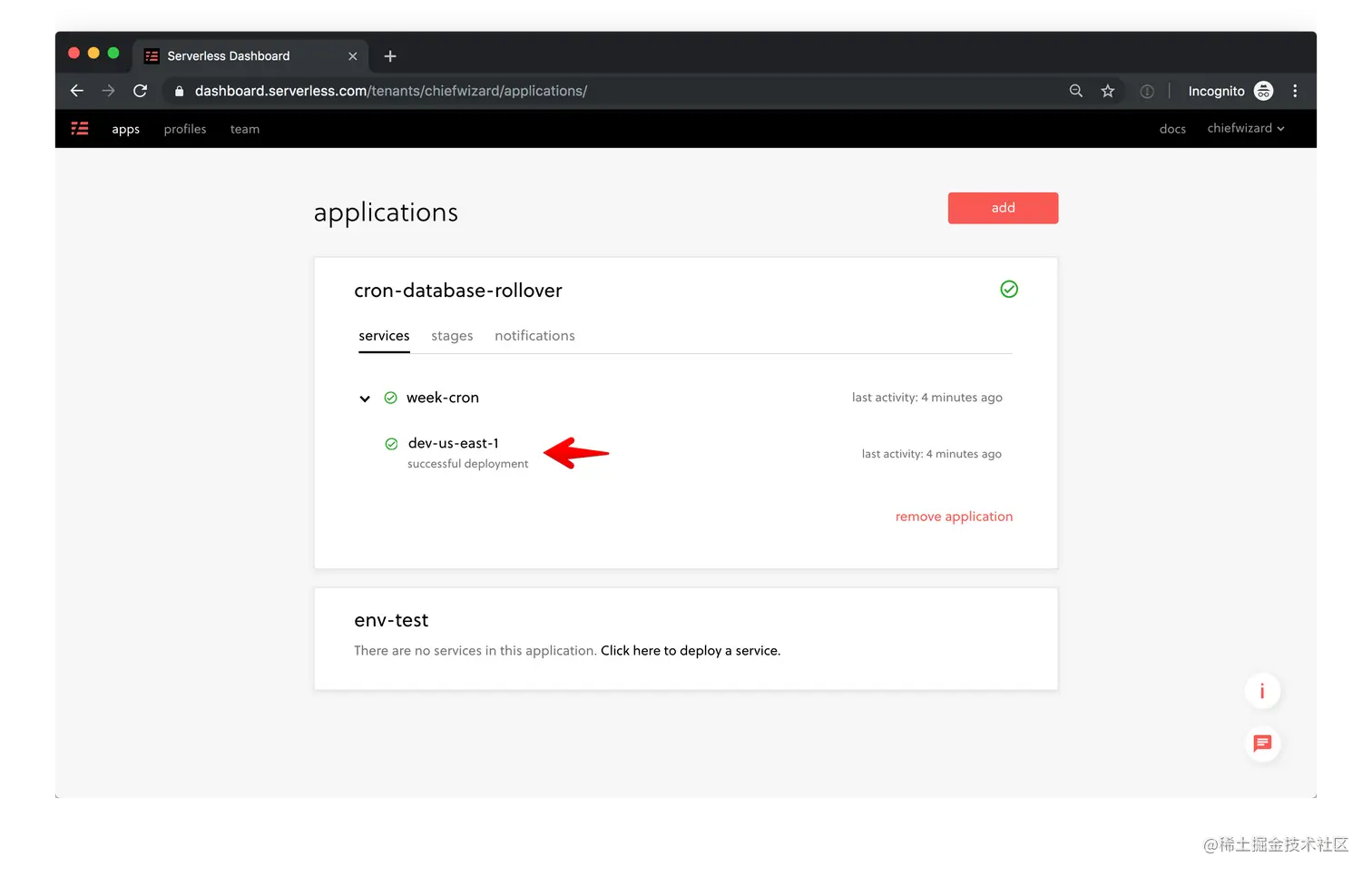 当你通过Serverless Dashboard进行部署时(我们推荐的方法),一旦cron job被部署,监控就已经设置好了。在应用程序页面上,我们点击进入我们刚刚运行的部署。