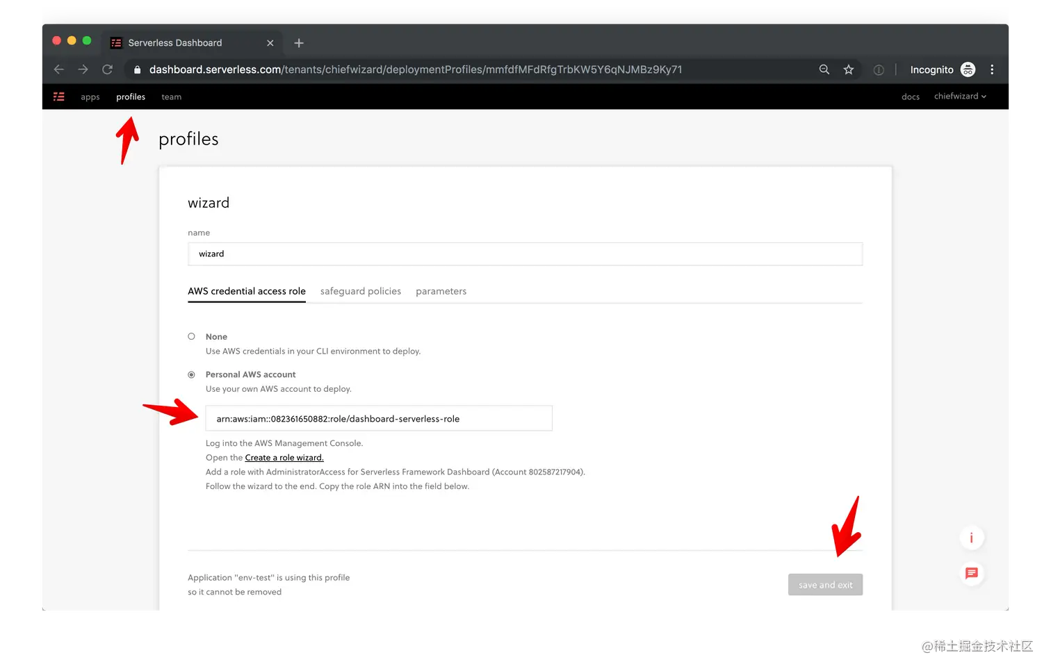 在Dashboard中,导航到Profiles → Create or choose a profile → AWS credential access role。