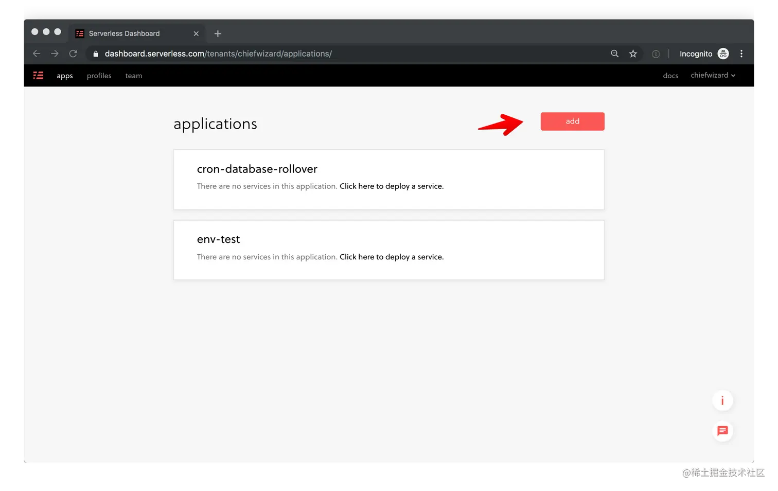 在部署之前,如果你还没有一个账户,请注册Serverless Dashboard。一旦你的账户设置完毕,就使用添加按钮创建一个新的应用程序。