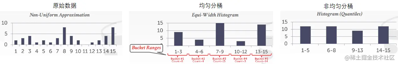通过分桶,原始凌乱的离散(连续)数据分成了相对均匀的统计信息。其中类似第三种等深直方图的方法现在也被大部分数据库采用