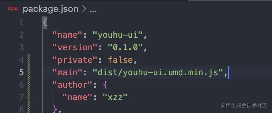 *2.包的入口文件一定要找dist/youhu-ui.umd.js这个文件才行,所以在package.json中添加 main:"dist/youhu-ui.umd. min .js" ,这样写的话默认导入就是导入 youhu-ui.umd.js 导出的东西