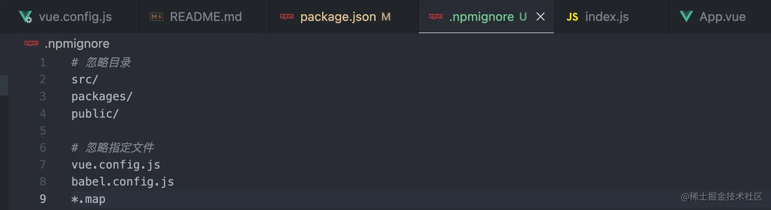 3.还要在youhu-ui里面添加 .npmignore的文件,忽略掉一些东西,不被npm上传,用户只下载dist包就够了,