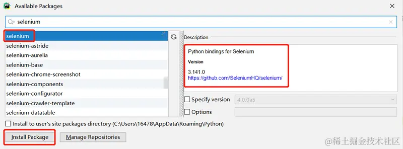 Selenium 是 Python 的第三方库,可采用 PyCharm 自带方式安装。