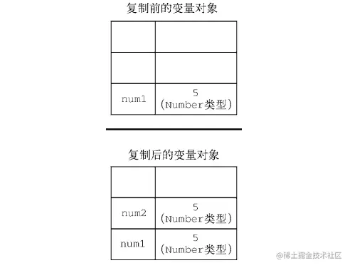 在内存中通过变量把一个原始值赋值到另一个变量是,原始值会被复制到新变量得位置,两个变量可以独立使用,互不干扰