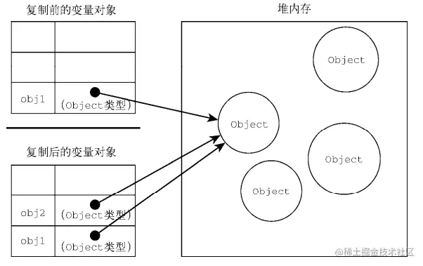 - 把引用值从一个变量赋给另一个变量时,存储在变量中的值也会被复制到新变量所在的位置,相当于是把这个值在堆内存中的地址告诉了另外一个变量,让另外一个变量也能通过这个地址访问和使用到这个值。因为有两个变量都指向同一个对象,所以就符合了第一条的逻辑