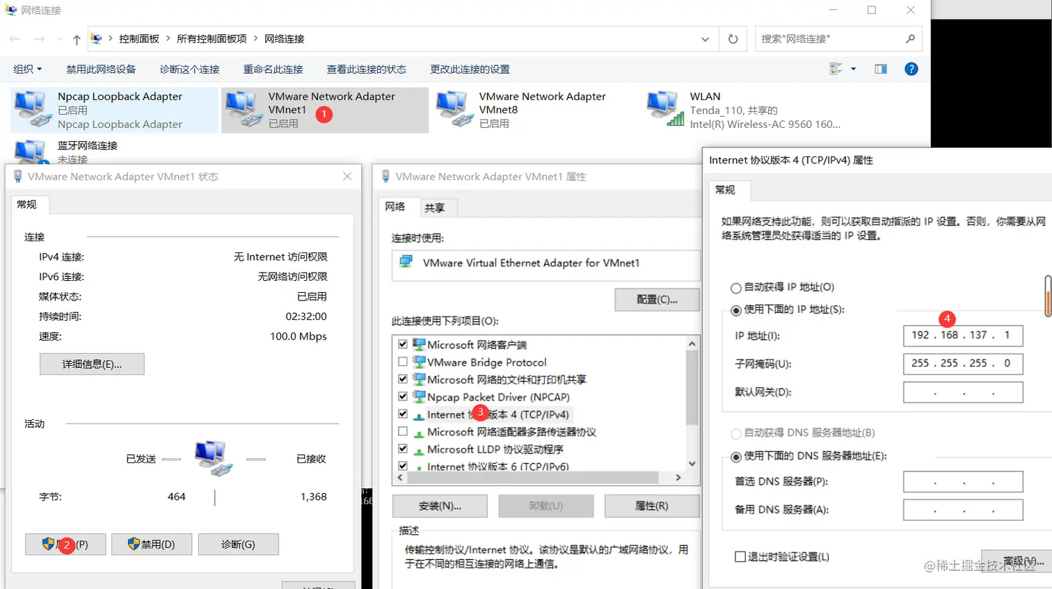 4)host-only模式如果要使得虚拟机能联网,我们可以将主机网卡共享给VMware Network Adapter VMnet1网卡,从而达到虚拟机联网的目的。接下来,我们就来测试一下。