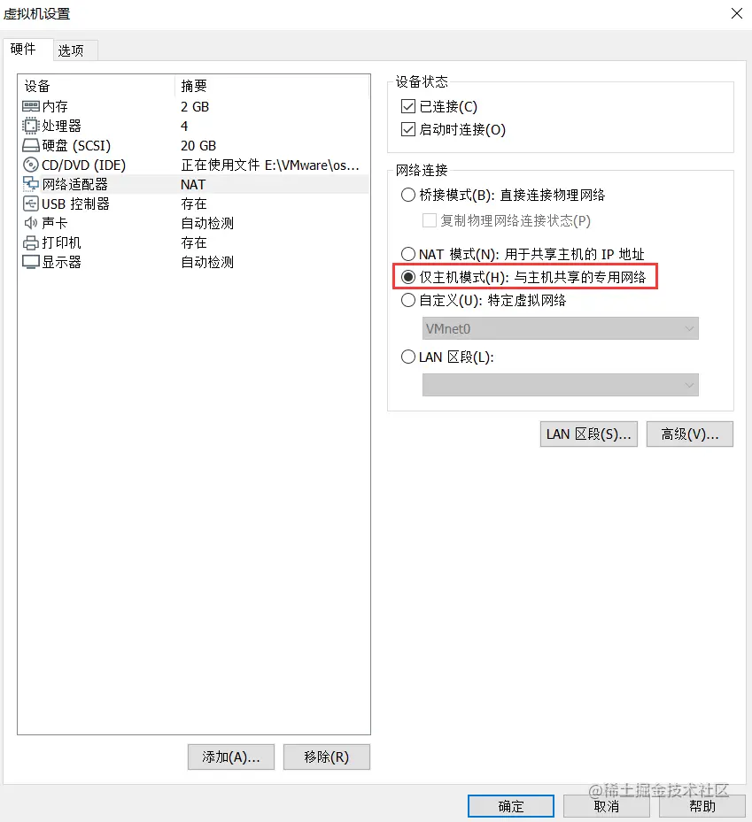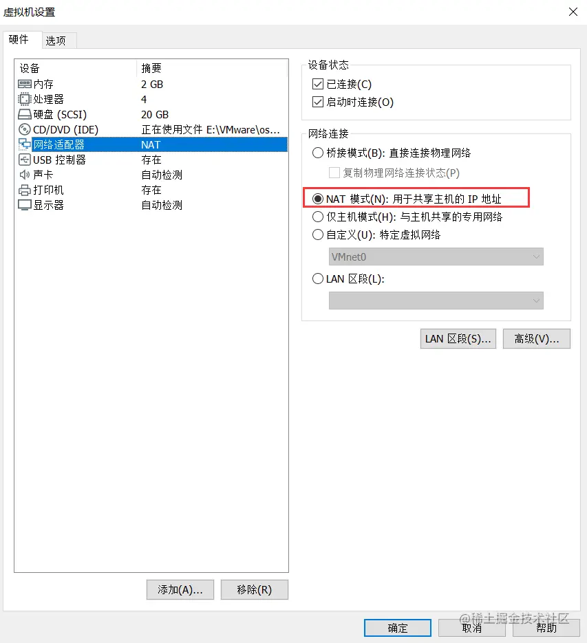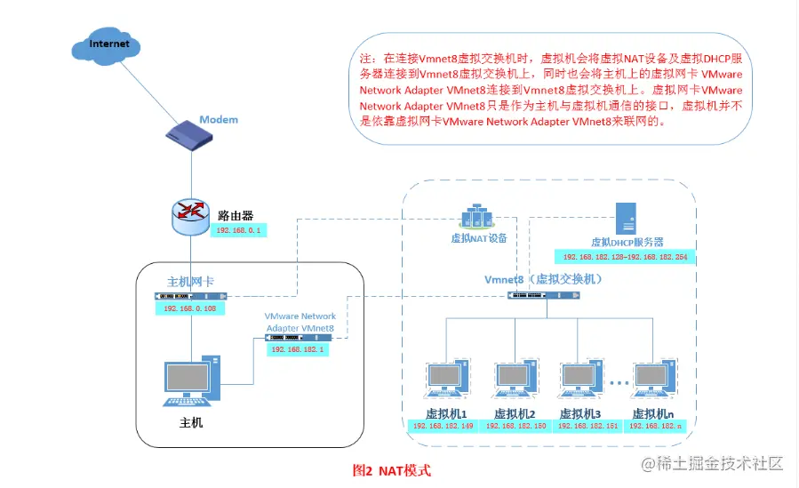 那么,这就是NAT模式,利用虚拟的NAT设备以及虚拟DHCP服务器来使虚拟机连接外网,而VMware Network Adapter VMnet8虚拟网卡是用来与虚拟机通信的。