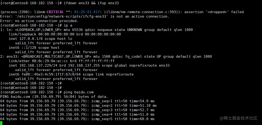 ifdown ens33 && ifup ens33 # 验证可行,其它命令自行验证