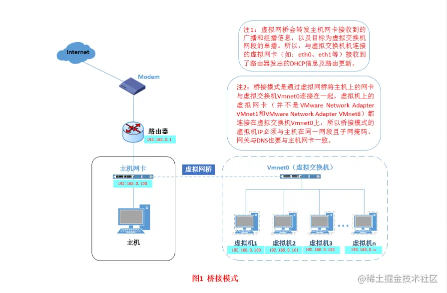 什么是桥接模式?桥接模式就是将主机网卡与虚拟机虚拟的网卡利用虚拟网桥进行通信。在桥接的作用下,类似于把物理主机虚拟为一个交换机,所有桥接设置的虚拟机连接到这个交换机的一个接口上,物理主机也同样插在这个交换机当中,所以所有桥接下的网卡与网卡都是交换模式的,相互可以访问而不干扰。在桥接模式下,虚拟机ip地址需要与主机在同一个网段,如果需要联网,则网关与DNS需要与主机网卡一致。其网络结构如下图所示:
